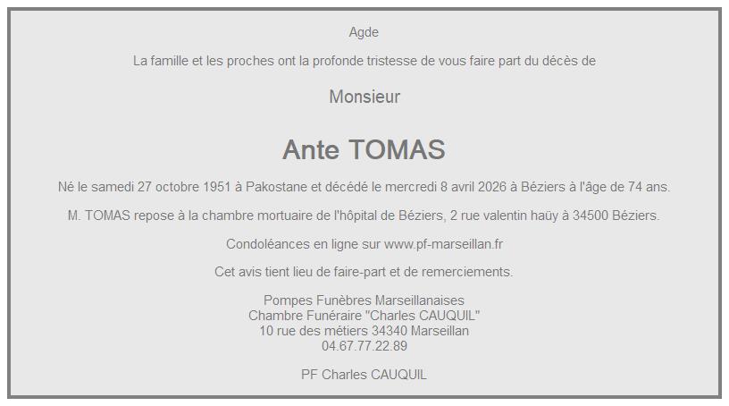 Décédé à Béziers (34500, France) le mercredi 8 avril 2026 à l'âge de 74 ans