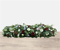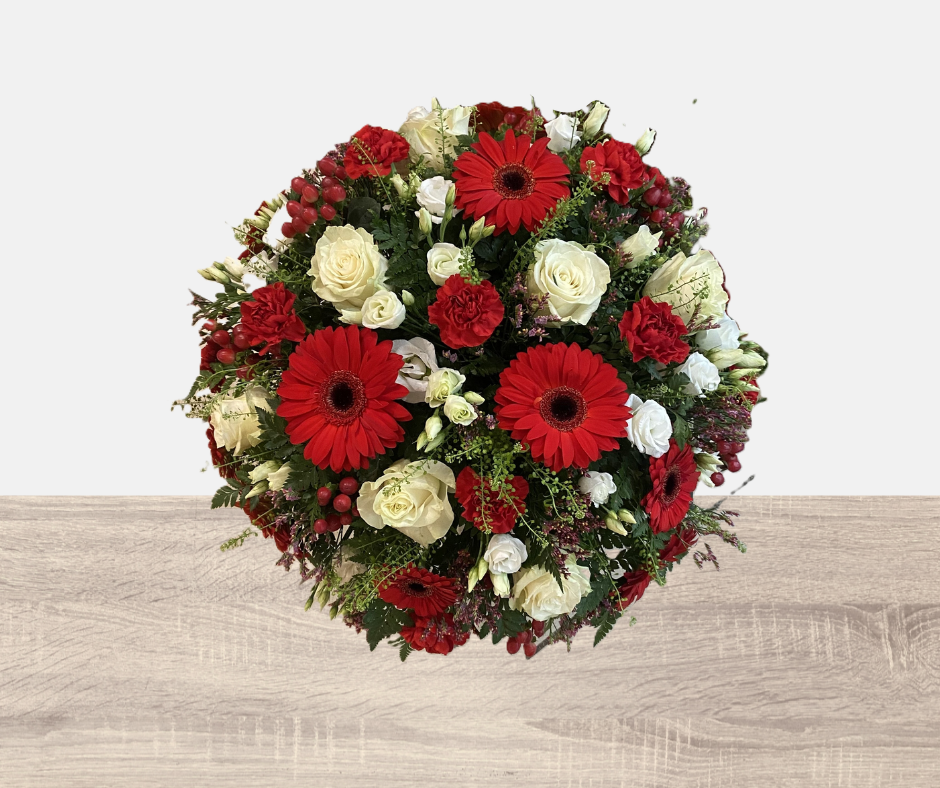 Grand dessus de cercueil avec des fleurs rouge et blanche.